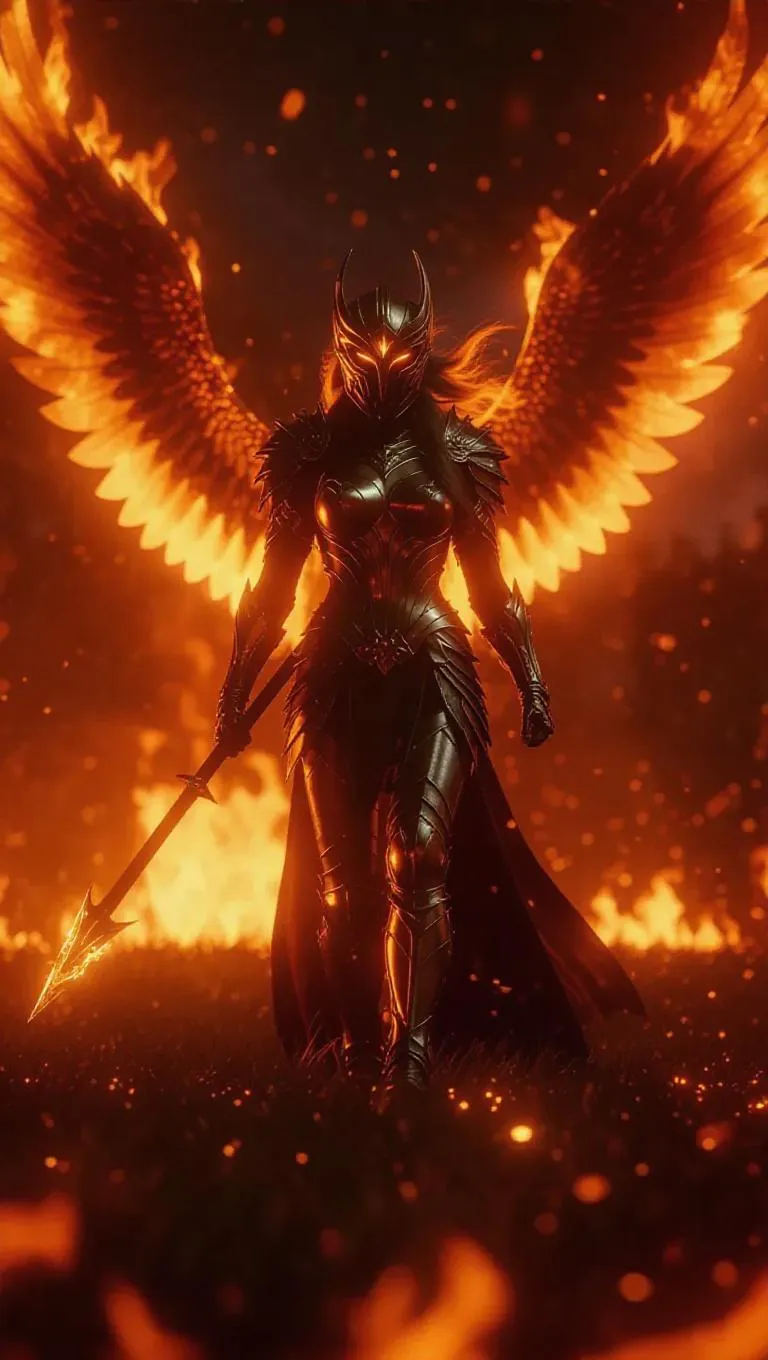 A Valkyrie of fire standing in a field of embers, her wings made of roaring flames, eyes glowing like molten gold, her spear igniting the battlefield below, epic fantasy, cinematic detail