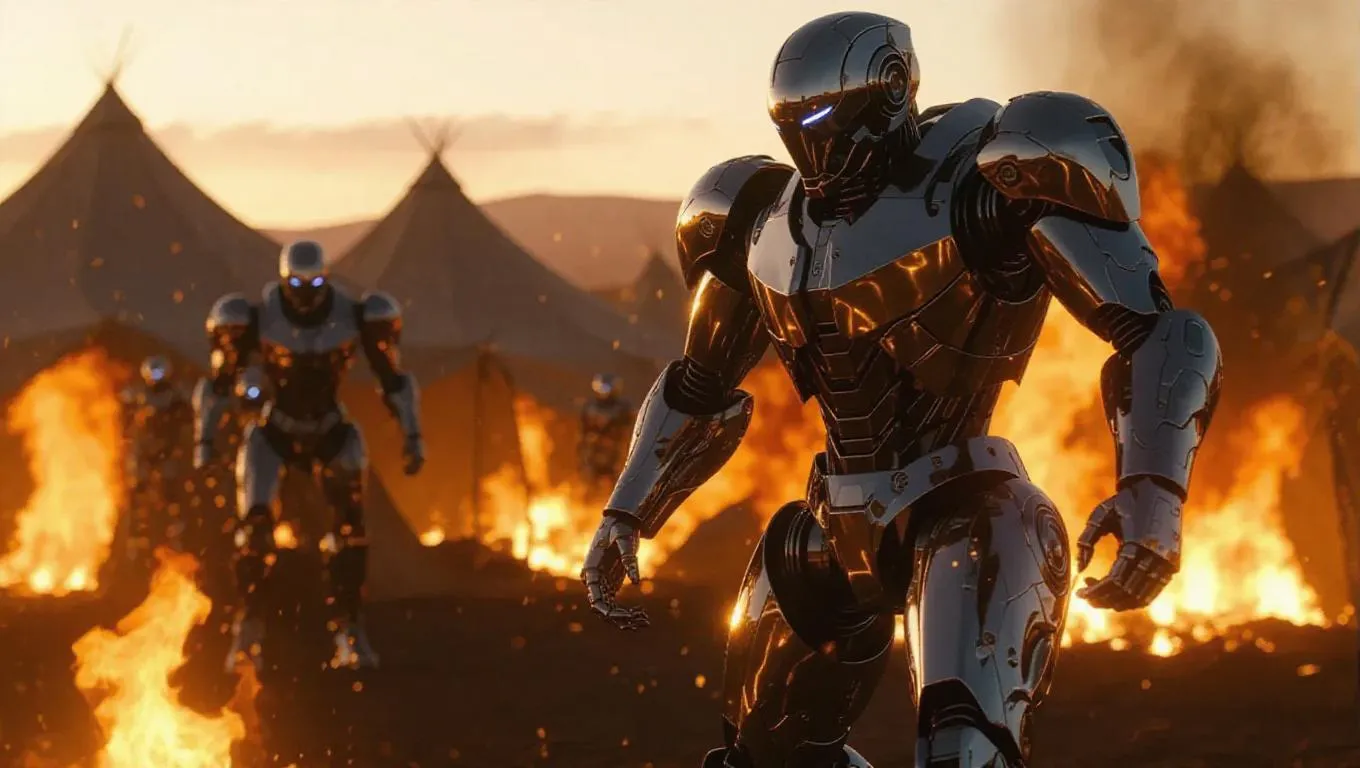 Robotic peacemakers with molten metal skin battling sentient flames in a refugee camp, sparks flying over burning tents. Dynamic mecha combat scene, chrome reflections distorted by heatwaves, with a robot engulfed in flames.