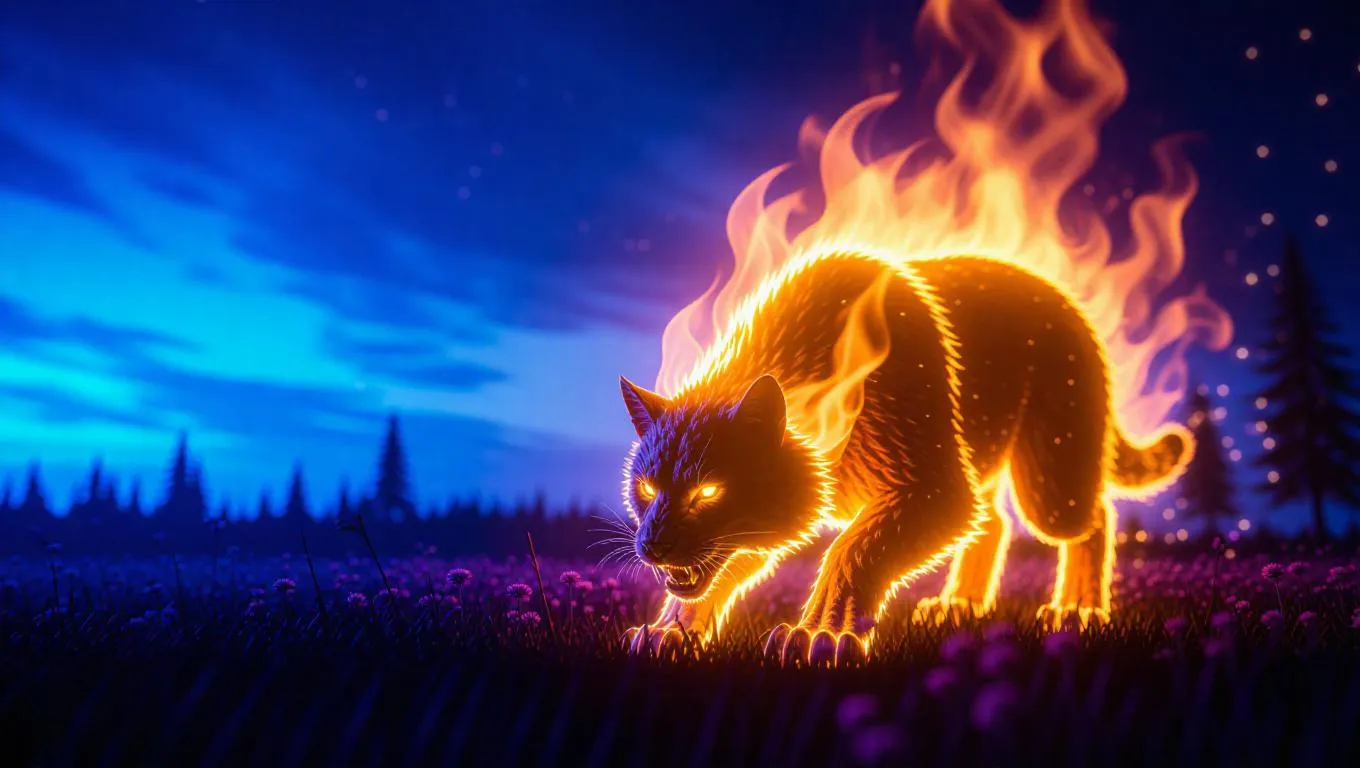 A fire beast prowls through a vibrant meadow, its body covered in flames, the fire reflecting in its glowing eyes, as it moves with predatory grace, leaving a trail of destruction in its wake