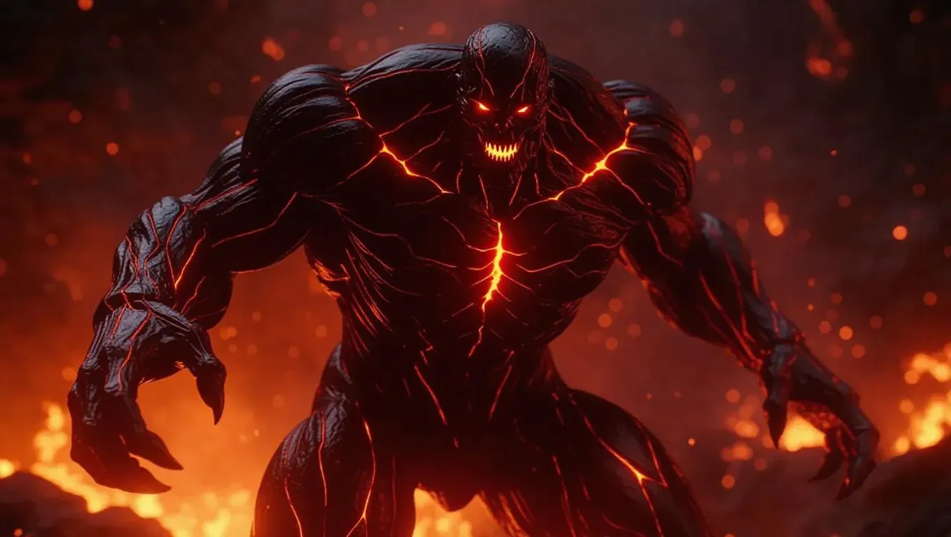 A towering lava golem with veins of molten rock, every movement releasing explosive bursts of fire, its eyes glowing like miniature suns, ultra-detailed, cinematic destruction.