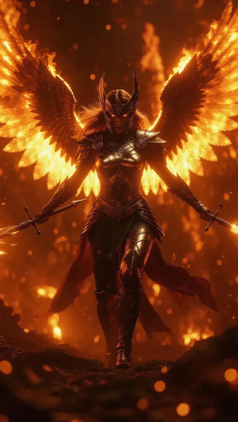 A Valkyrie of fire emerging from the depths, her wings made of roaring flames, eyes glowing like molten gold, her spear igniting the battlefield below, epic fantasy, cinematic detail