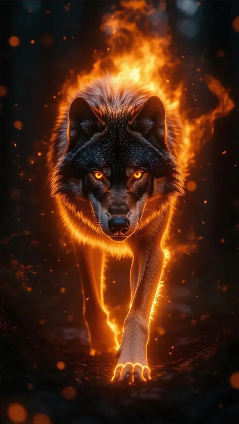 A majestic wolf composed entirely of flames, emerging from a whirlwind of fire in a dark enchanted forest, glowing eyes, sparks trailing its movements, hyper-realistic, cinematic lighting.