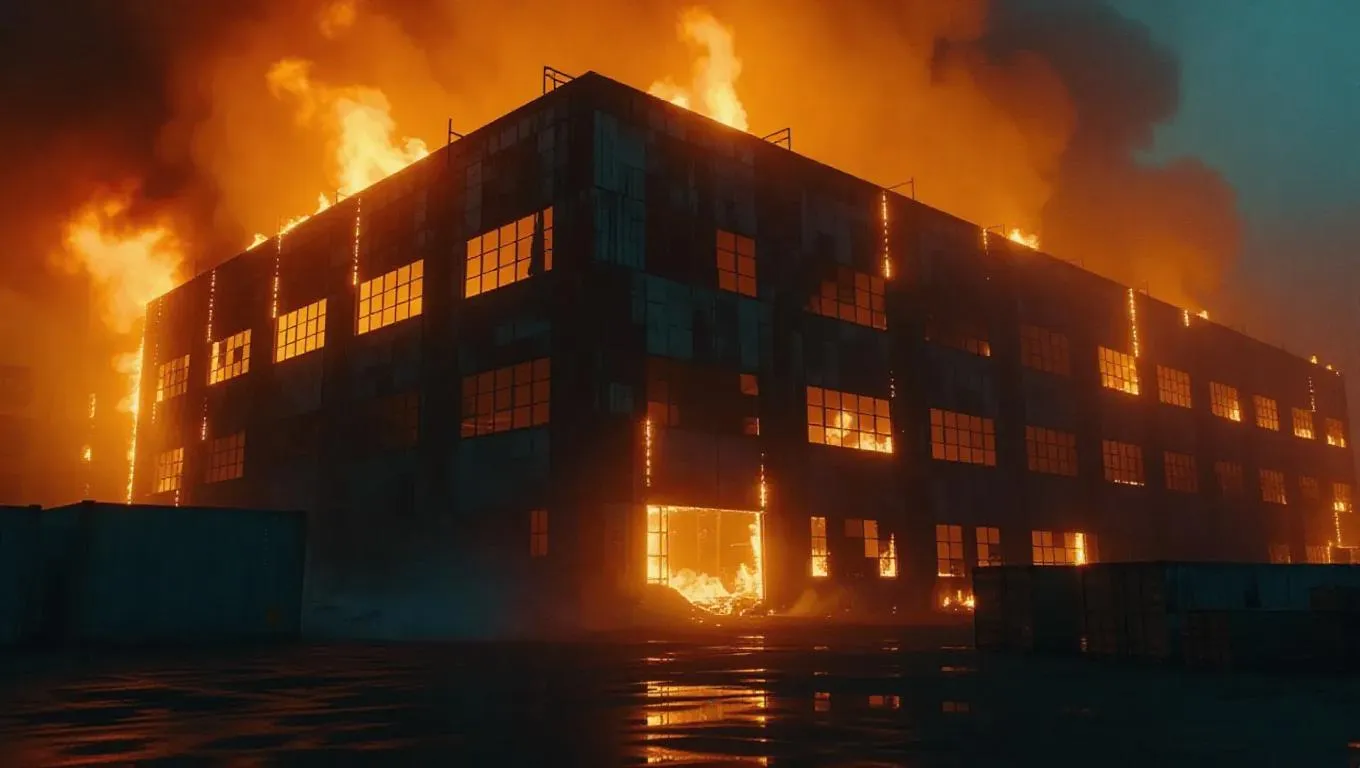 a warehouse engulfed in flames, firelight reflecting on its metal walls as it slowly collapses, the structure collapsing in on itself with intense heat and smoke.