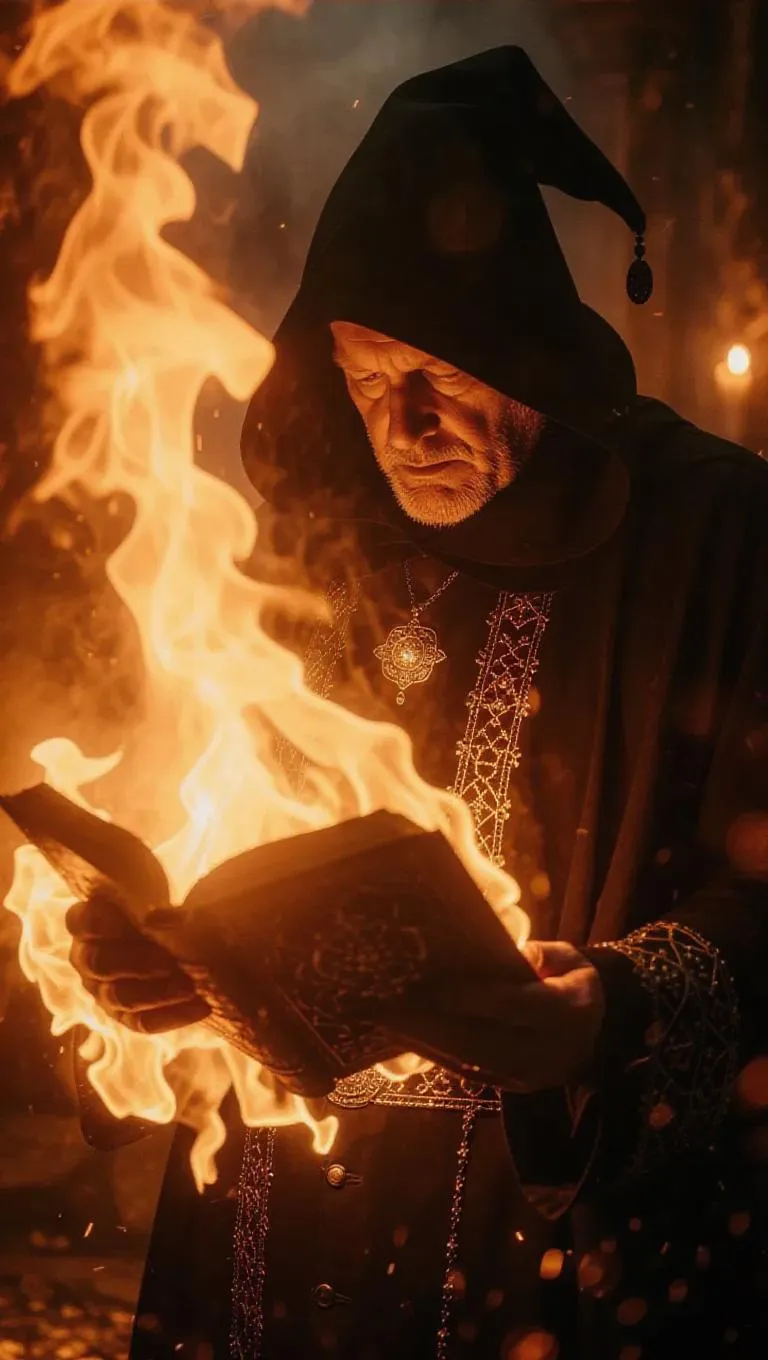 A sorcerer opening an old grimoire, the pages exploding with supernatural flames, swirling magical sigils around him, deep shadows, ultra-HD.
