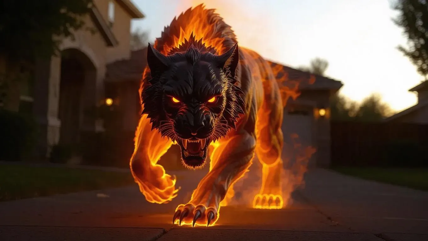 A fire beast prowls through a suburban neighborhood, its body covered in flames, the fire reflecting in its glowing eyes, as it moves with predatory grace, leaving a trail of destruction in its wake