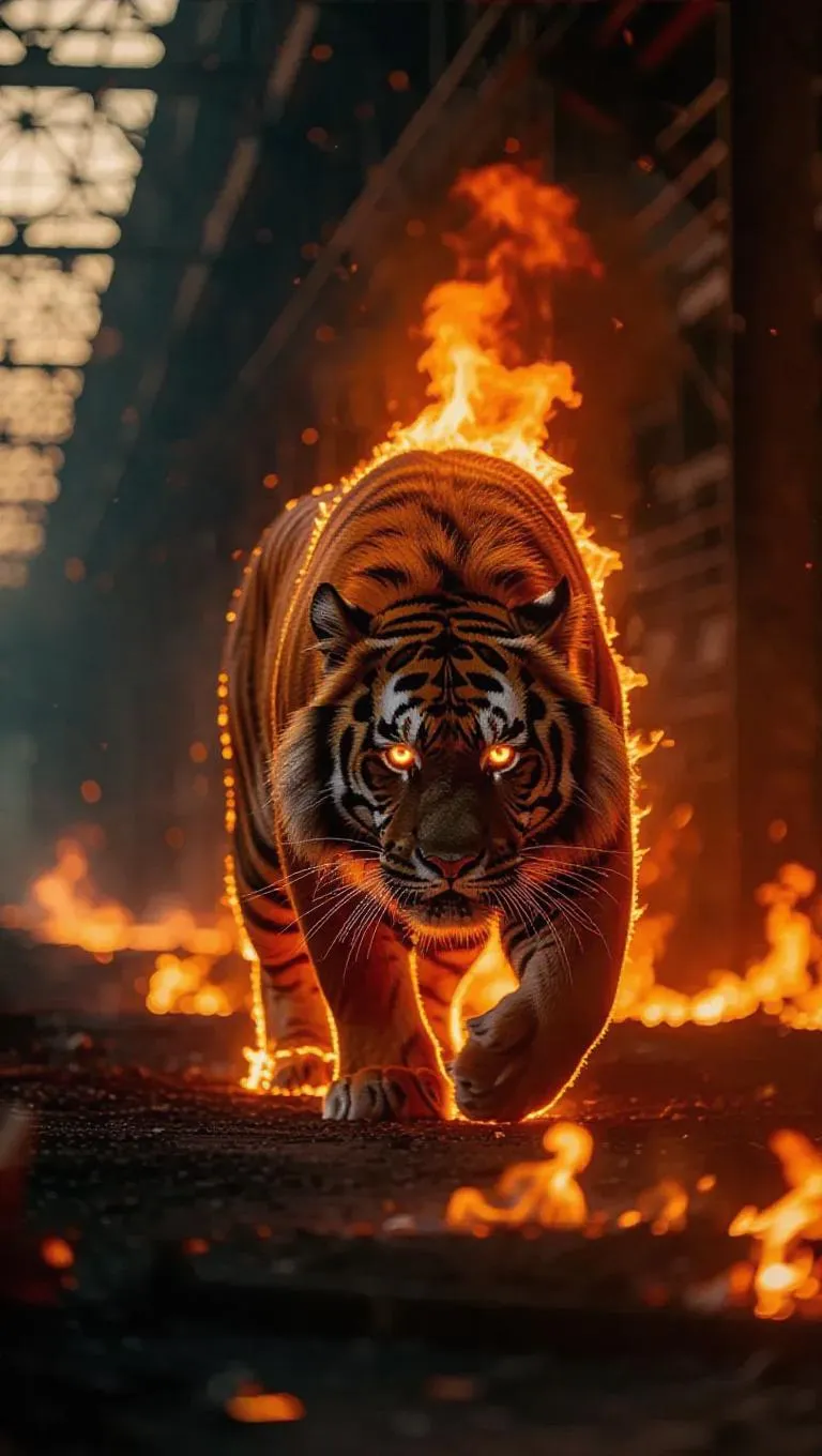A fire beast wanders through a burning industrial site, its body covered in flames, the fire reflecting in its glowing eyes, as it moves with predatory grace, leaving a trail of destruction in its wake