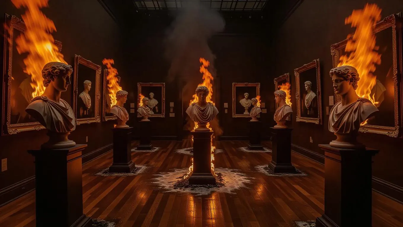 An art gallery, once a sanctuary for priceless masterpieces, is now a raging inferno. The walls, once adorned with classical busts, are now a charred, blackened husk. Flames leap from bust to bust, consuming the stone and marble with voracious intensity. The wooden floors are cracked and glowing red-hot, as if the very foundation of the gallery is being devoured by the fire. The air is thick with the acrid smell of burning stone and ash, making it nearly impossible to breathe.