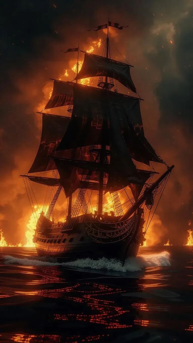 An abandoned pirate ship sailing through a sea of fire, its tattered sails burning yet unconsumed, dark fantasy illustration, hyper-realistic flames.