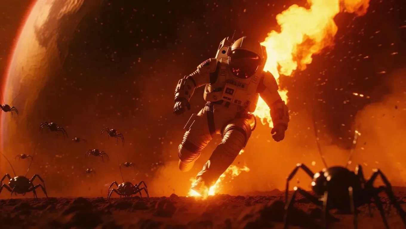A futuristic explorer in a high-tech suit suddenly bursts into flames while battling a swarm of robotic insects on an alien planet, the fire consuming their body, the scene illuminated by the planet's strange atmosphere.