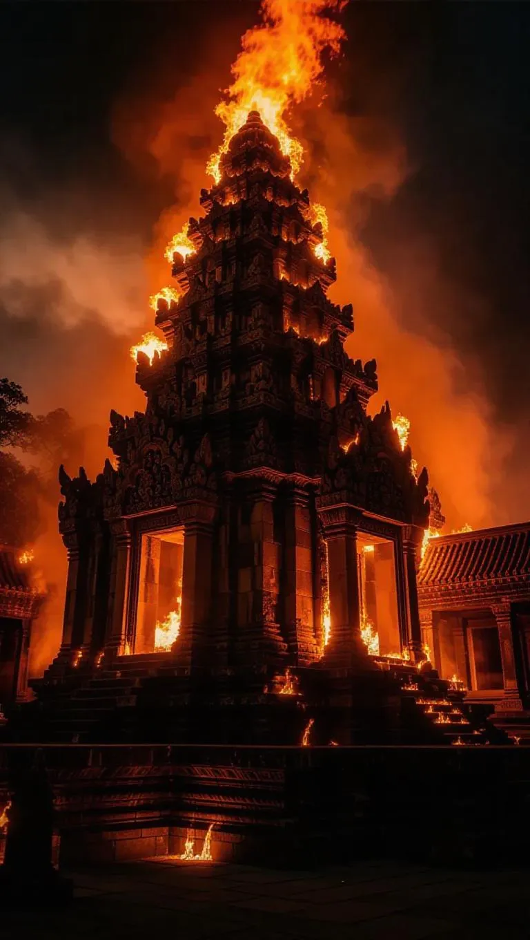 a temple engulfed in flames, firelight reflecting on its ancient stones as it slowly erodes, the structure collapsing in on itself with intense heat and smoke.