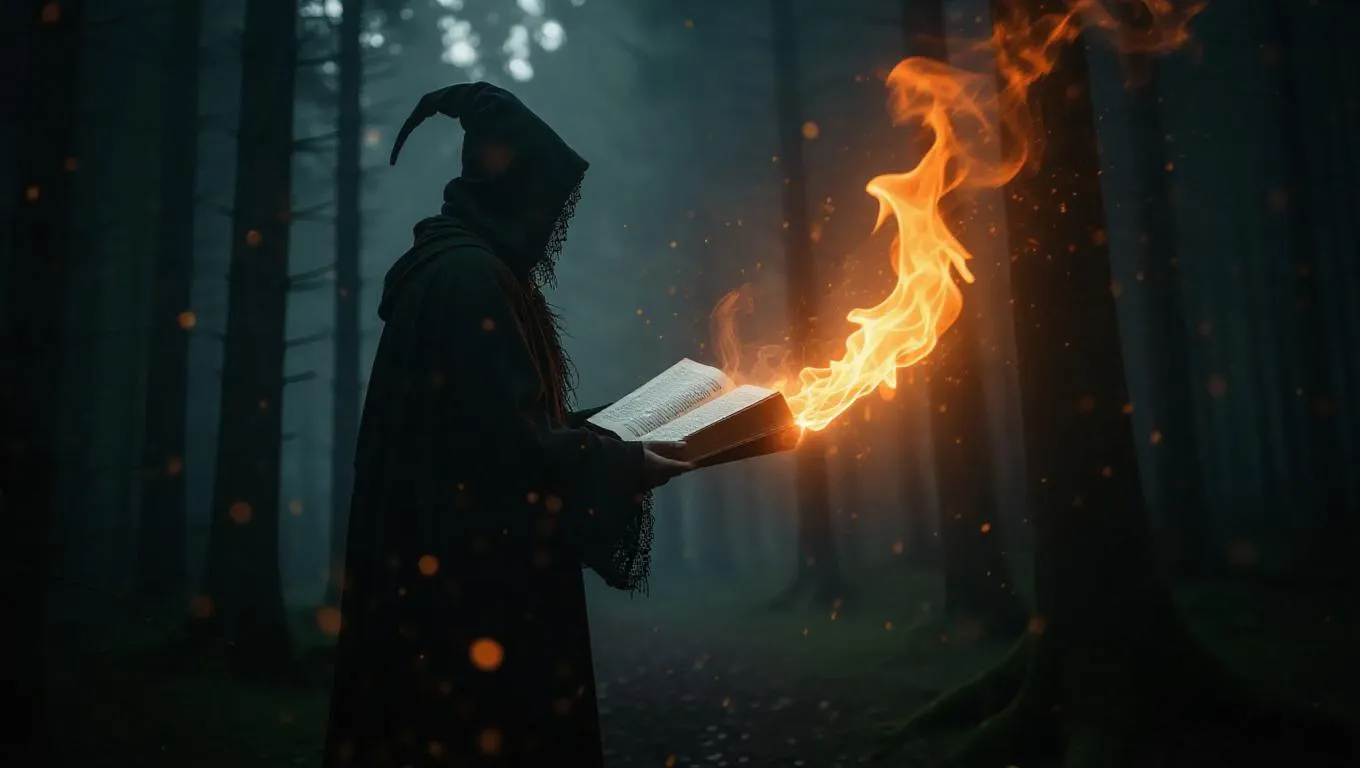 A sorcerer standing in a dark forest, an ancient book opening, the pages erupting into supernatural flames, glowing runes in the mist, ethereal lighting, ultra-HD.
