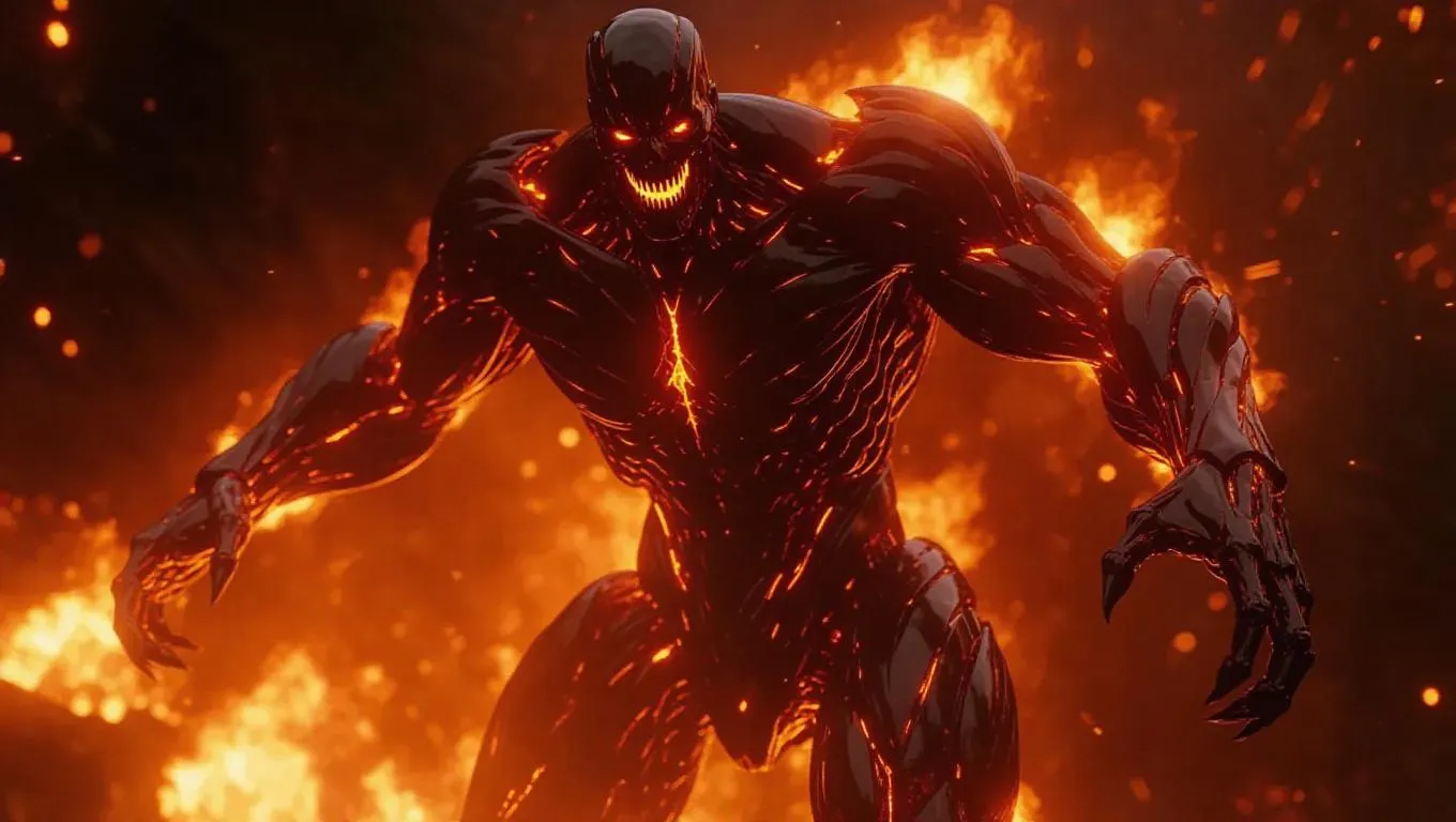 A towering fire golem with veins of blazing heat, every movement releasing explosive bursts of flames, its eyes glowing like blazing suns, ultra-detailed, cinematic destruction.