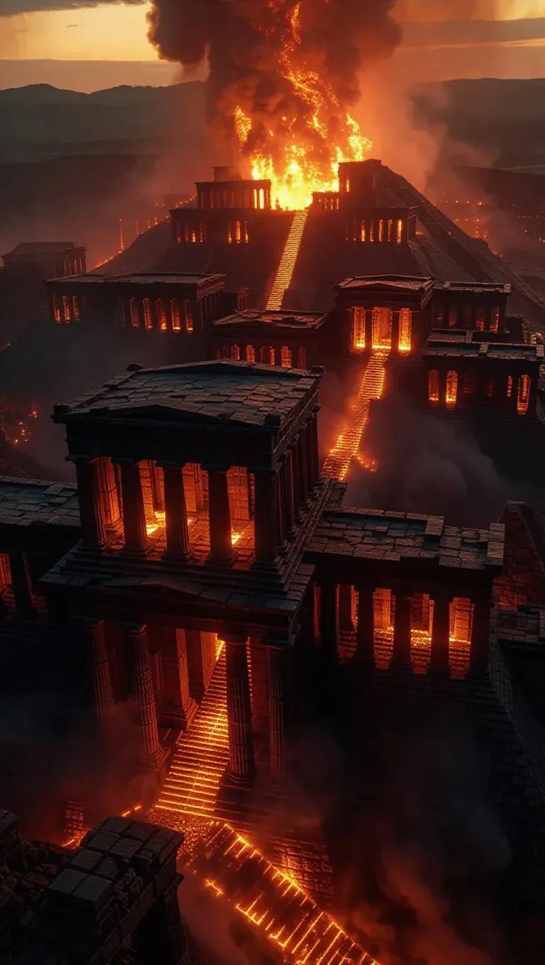 AI archaeologists revealing Atlantis using volcanic ash visuals, each eruption chronicling the city's disaster in fiery arcs. Lidar-structured ruins mingling with Celtic art flames.