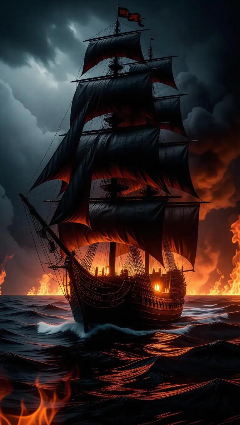 A spectral pirate ship navigating a fiery ocean, its tattered sails aflame yet resilient, dark fantasy design, hyper-realistic flames.