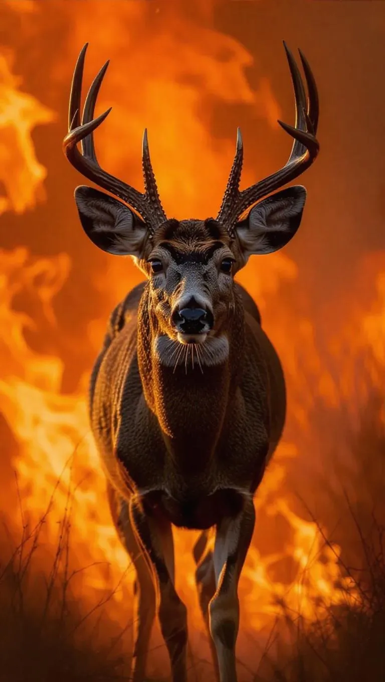 a mule deer fleeing a California wildfire, its fur reflecting the licking amber flames. Use a Phantom Flex 4K at 500fps to capture individual hairs igniting and curling upward. Dynamic inferno lighting casts shifting shadows across its contorted face, with fire reflections shimmering in dilated pupils. Billowing smoke filters golden-hour sunlight into a blood-orange haze