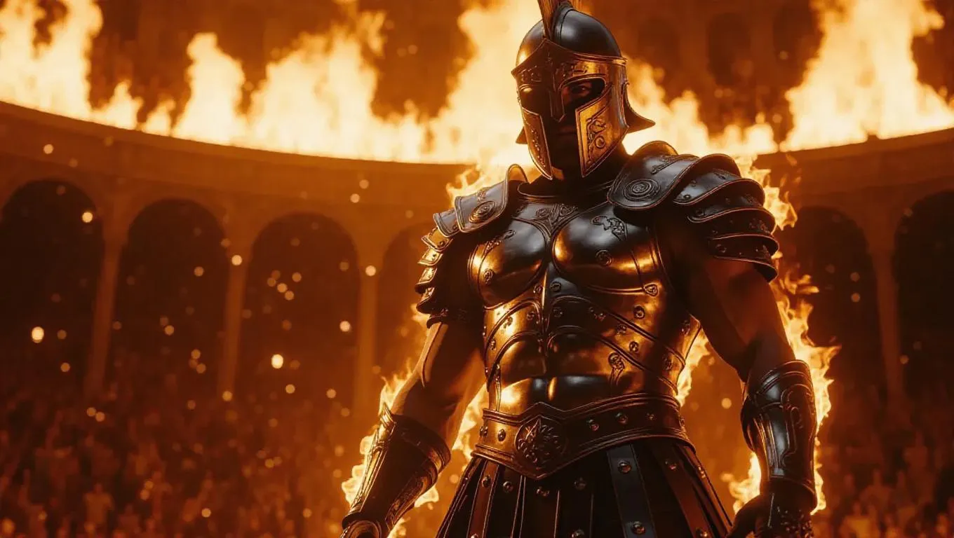 A fierce gladiator standing in the arena, his armor shining with fiery orange and silver flames, creating a dramatic silhouette, backlighting, ultra-detailed, gladiatorial realism