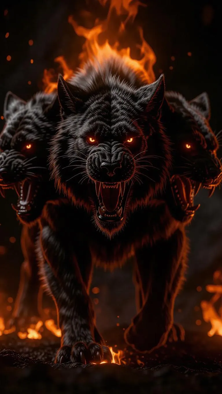 An ancient three-headed Cerberus with fur made of raging flames, each head spewing fire as it feeds on the darkness of the underworld, intense lighting, hyper-realistic textures
