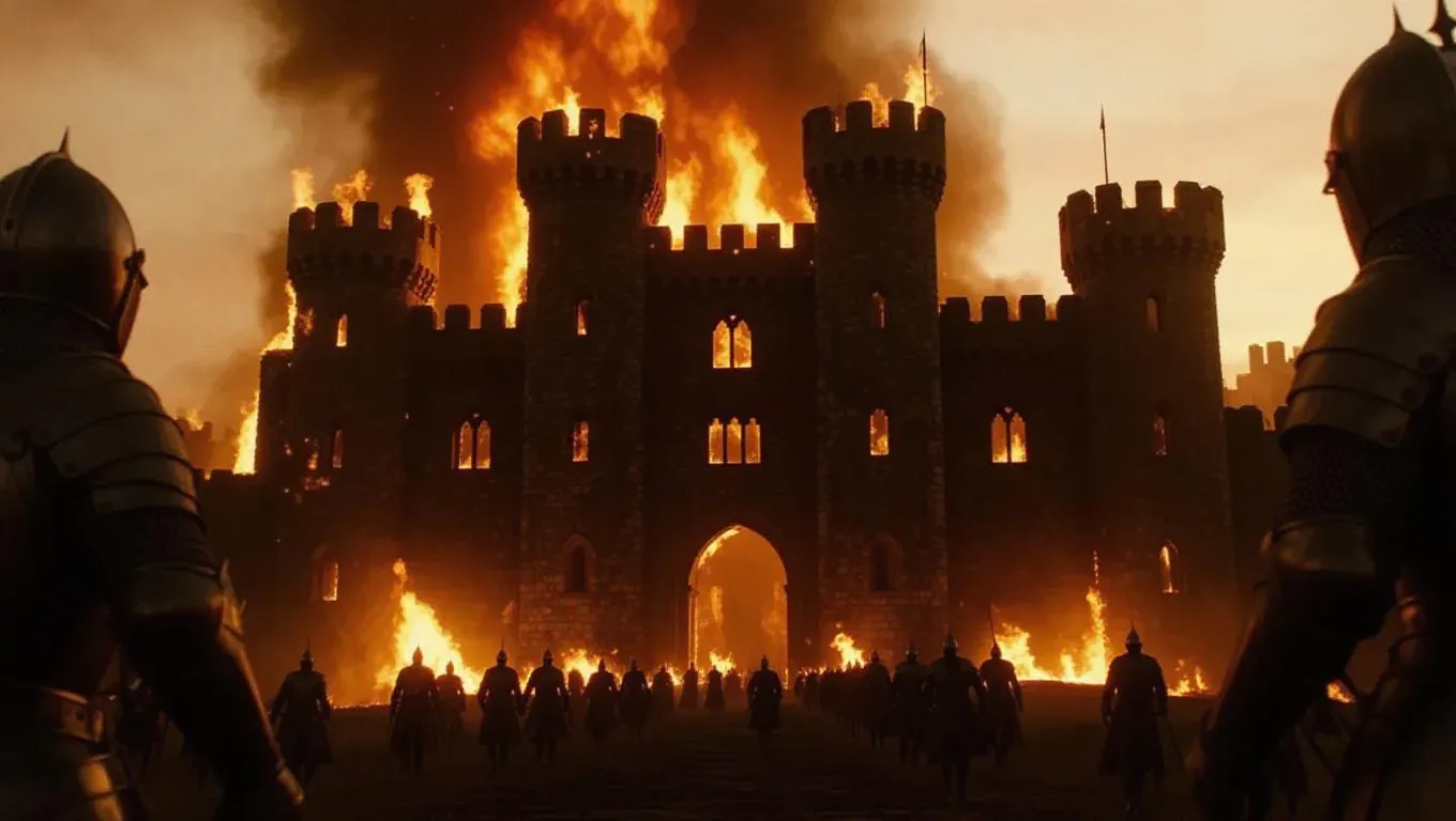 An ancient castle ablaze, with flames consuming everything in their path. Stone walls are reduced to charred ruins, and the ground is littered with melted artifacts. Knights flee in terror, their shouts echoing through the smoky air. The camera follows the fire's relentless advance, capturing the raw power and devastation of the blaze. The sound of roaring flames and crumbling stone creates a haunting and immersive experience.