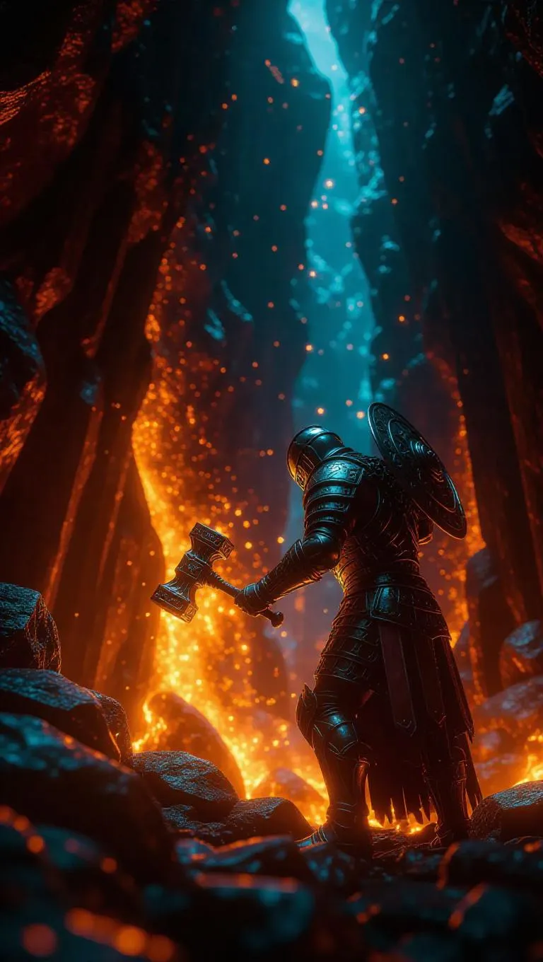 An artisan in a mystical valley, crafting shields from runic metals in volcanic flames, every strike drawing forth bright glimmers. Fantastic fable, hammer strikes evoking cosmic dances in the background, surrounded by swirling energies and radiant orbs.