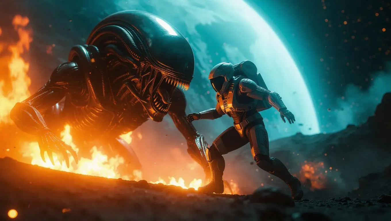 A futuristic explorer in a sleek armored suit suddenly bursts into flames while battling a monstrous alien creature on a desolate planet, the fire consuming their body, the scene illuminated by the planet's eerie glow.