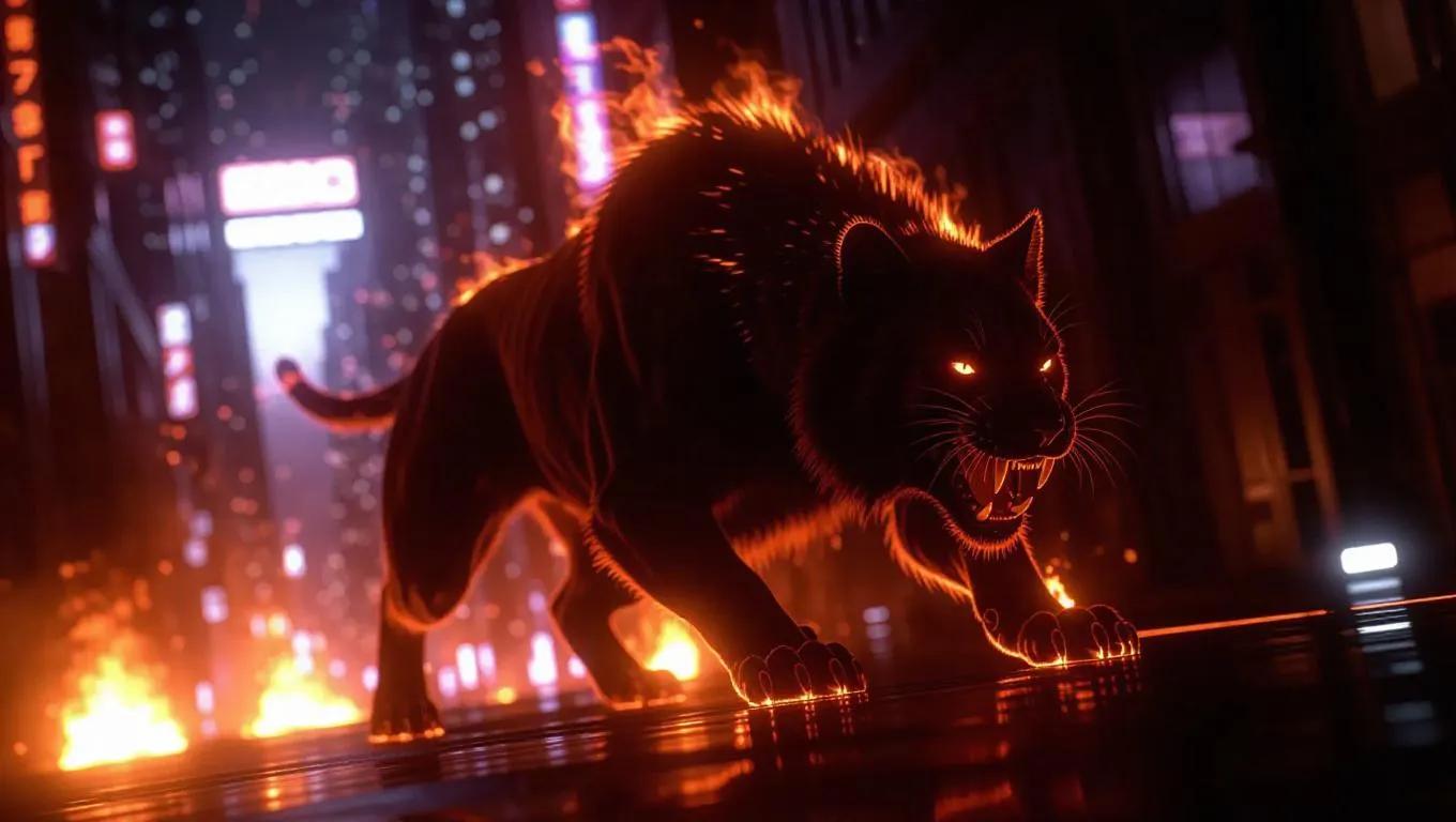 A fire beast prowls through a futuristic city, its body covered in flames, the fire reflecting in its glowing eyes, as it moves with predatory grace, leaving a trail of destruction in its wake