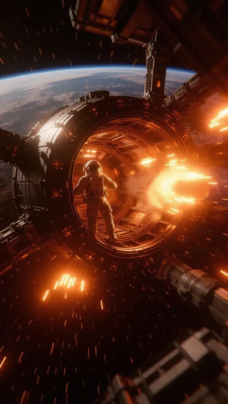 In the vastness of space, a space station is ablaze. The outer hull is pockmarked with explosions, with flames and sparks shooting out into the vacuum. Inside, the corridors are filled with smoke and fire, with astronauts in emergency suits trying to contain the disaster. The control room is a chaotic mess, with screens flickering and alarms blaring. The windows show the blackness of space, with the Earth visible in the distance, a stark contrast to the fiery chaos within. The station’s thrusters fire erratically, trying to stabilize the structure, but the flames continue to spread, threatening to consume everything.