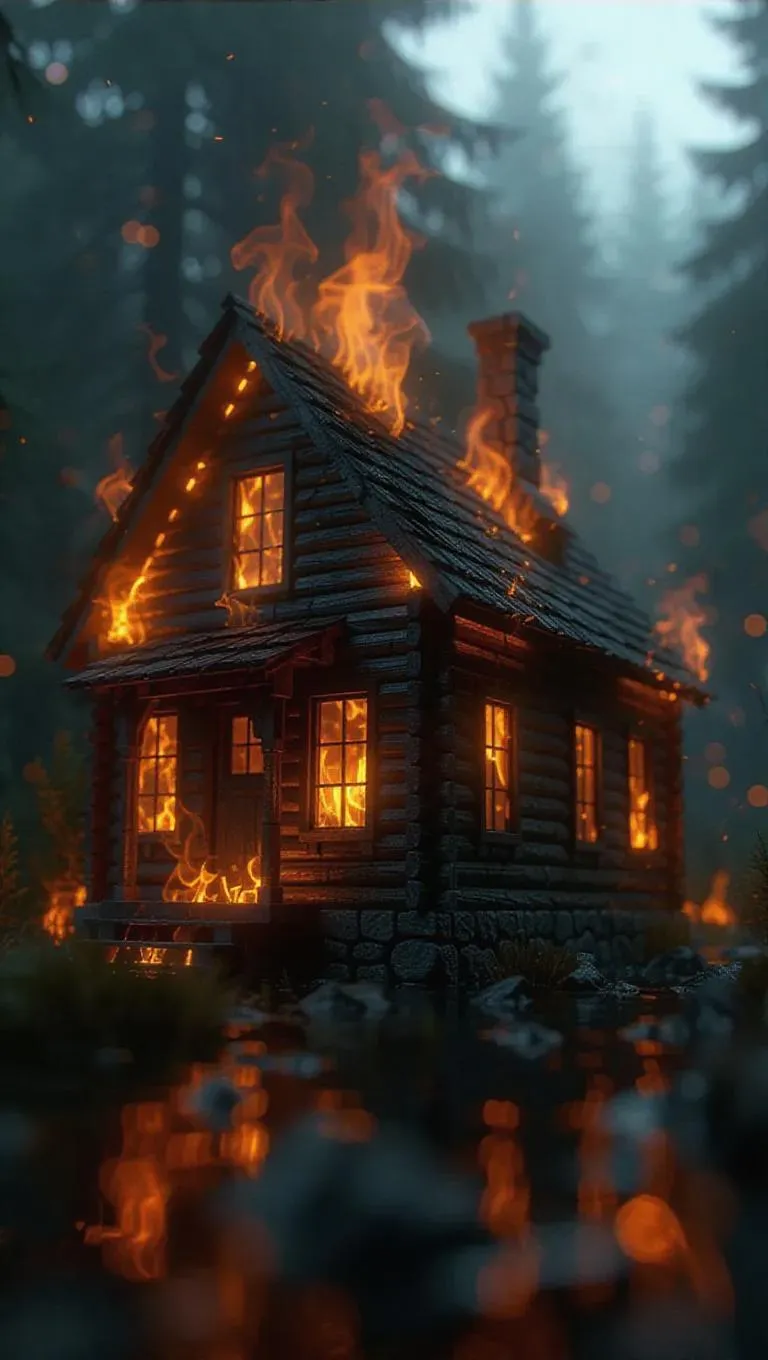 a cottage engulfed in flames, firelight reflecting on its wooden surface as it slowly charred, the structure collapsing in on itself with intense heat and smoke.