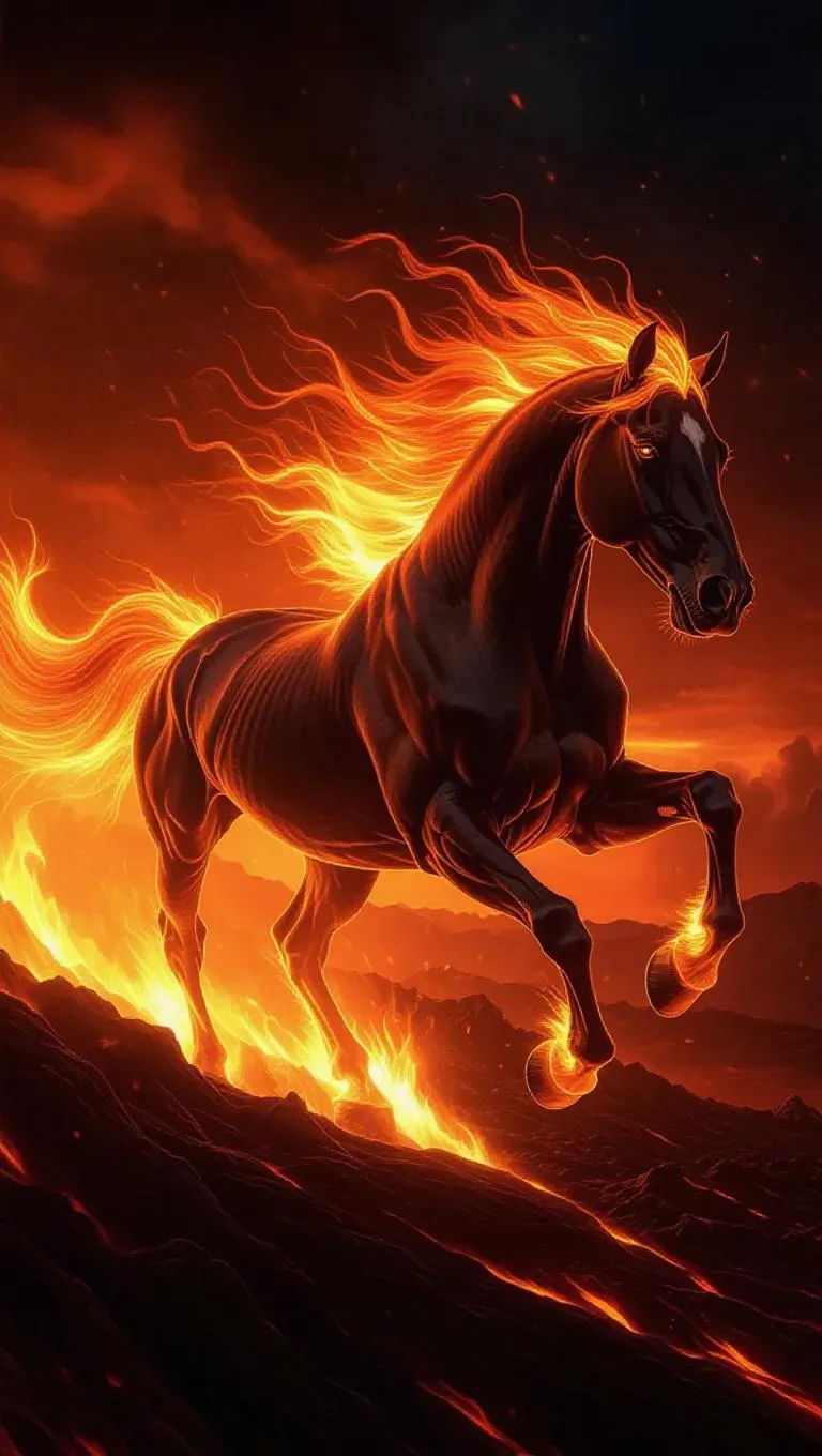 A mythical fire horse galloping across a volcanic landscape, its mane and tail blazing with supernatural flames, dramatic fantasy illustration, highly detailed