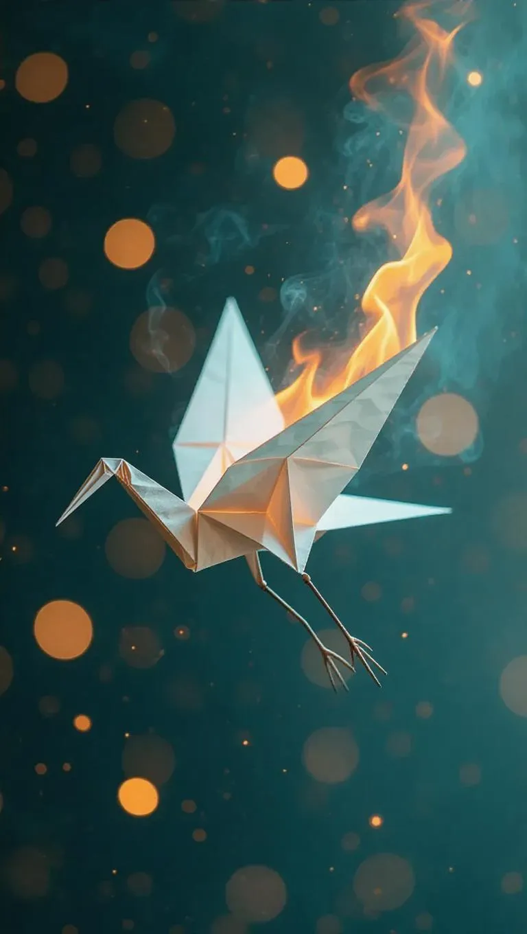 A delicate paper crane floating in the air, its edges slowly catching fire, glowing embers drifting away, cool teal light, tranquil atmosphere, ultra-detailed