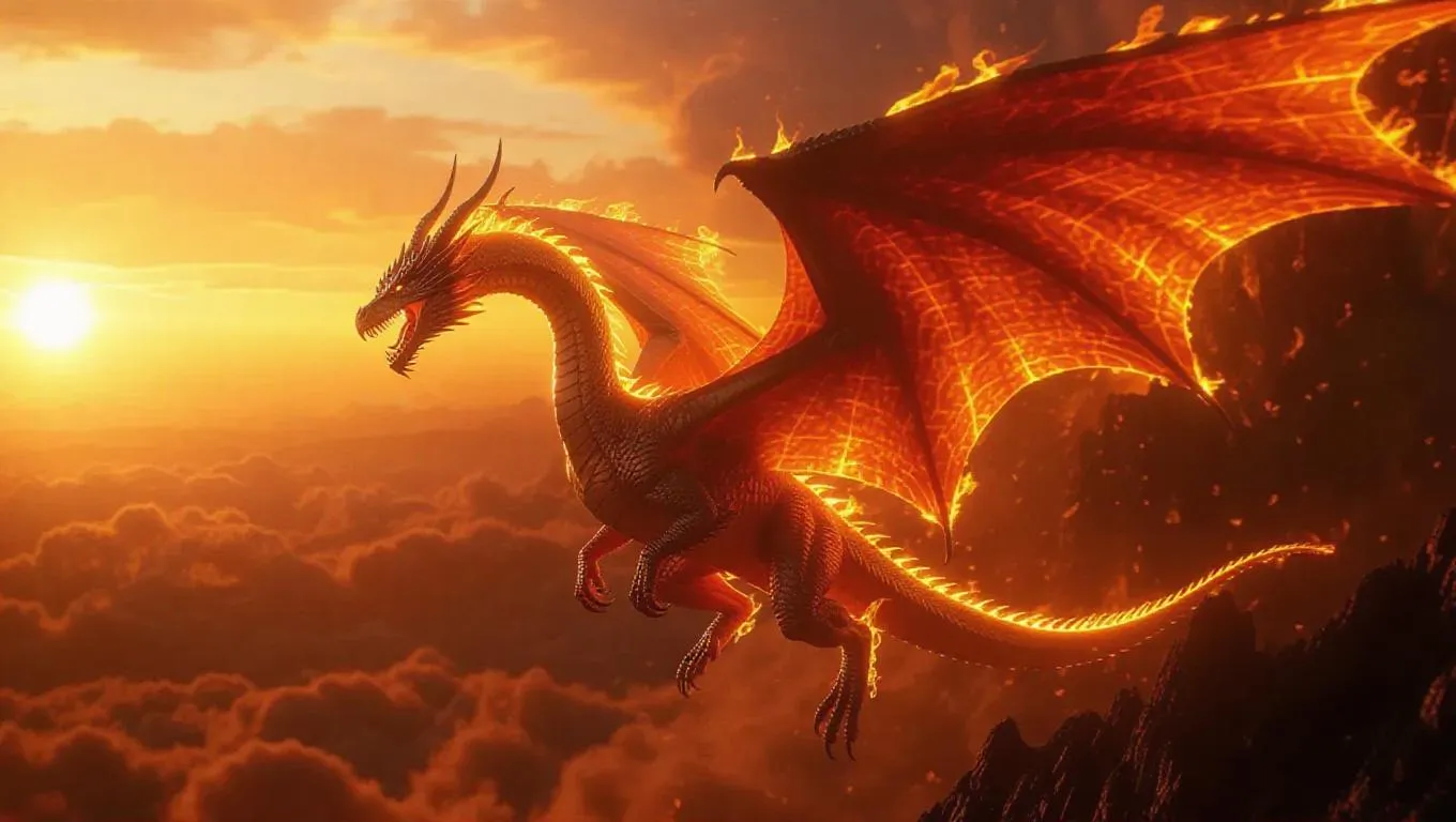 A colossal draconic creature made of blazing fire, wings unfurling like the sun, the sky ablaze with color, ultra-detailed, cinematic epic fantasy