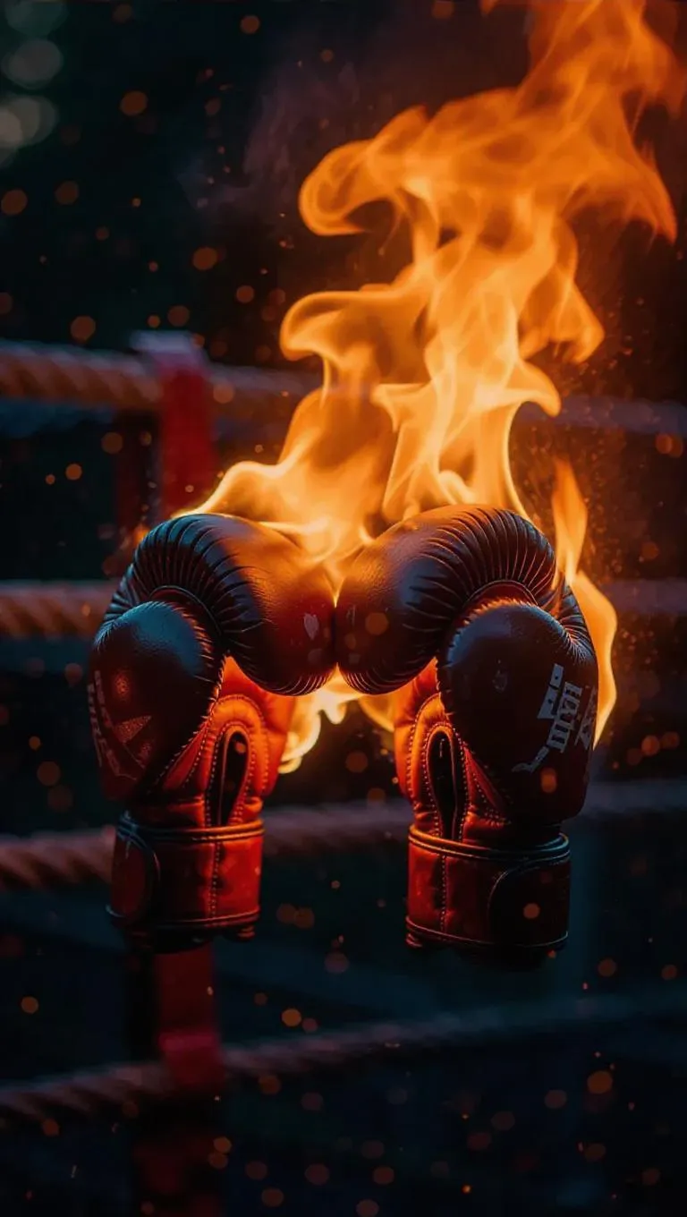 A pair of rugged boxing gloves suddenly catches fire during an extreme training session in a harsh environment, the flames spreading across the leather, the scene illuminated by the glow of the burning gloves.