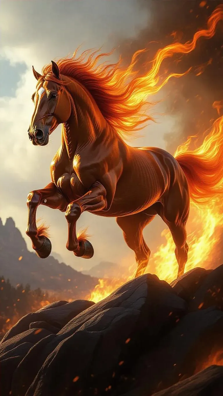 A legendary fire horse dashing across a rocky outcrop, its mane and tail blazing with supernatural flames, dramatic fantasy illustration, highly detailed