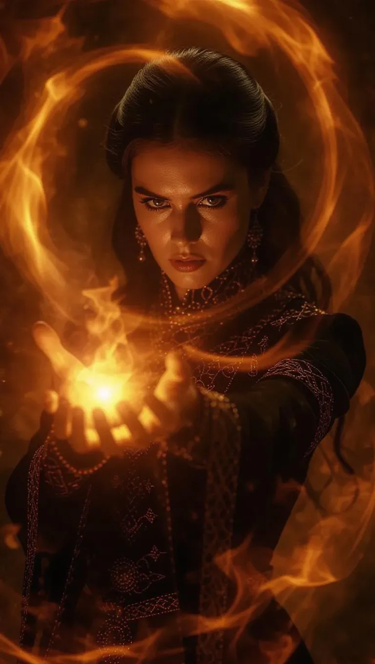 An ancient sorceress summoning fire magic, swirling flames forming chaotic patterns around her, mystical lighting, high fantasy, ultra-HD.