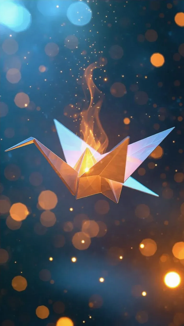 A delicate paper crane floating in the air, its edges slowly catching fire, glowing embers swirling around, soft golden light, dreamy atmosphere, ultra-detailed