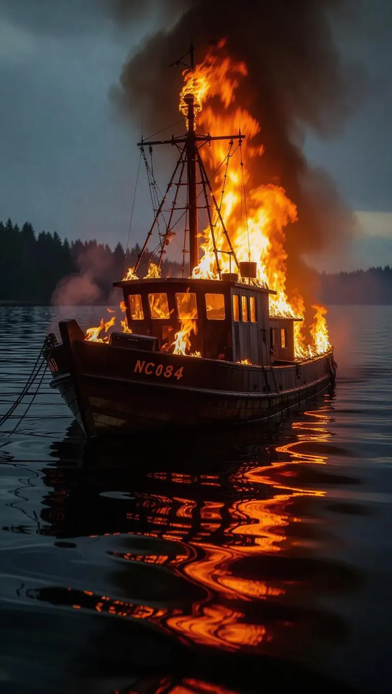 a dock engulfed in flames, firelight reflecting on its planks as it slowly sizzles, the structure collapsing in on itself with intense heat and smoke.