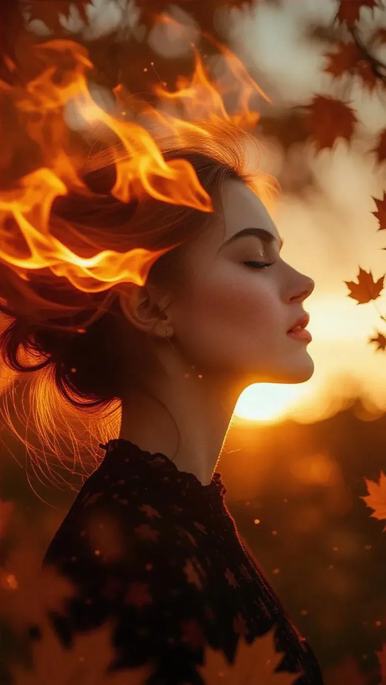 A surreal portrait of a woman with her hair transforming into vibrant flames, the fire gracefully dancing amidst autumn leaves, seamlessly blending with the warm hues of sunset, dreamy and ethereal, ultra-detailed, cinematic lighting, glowing embers.