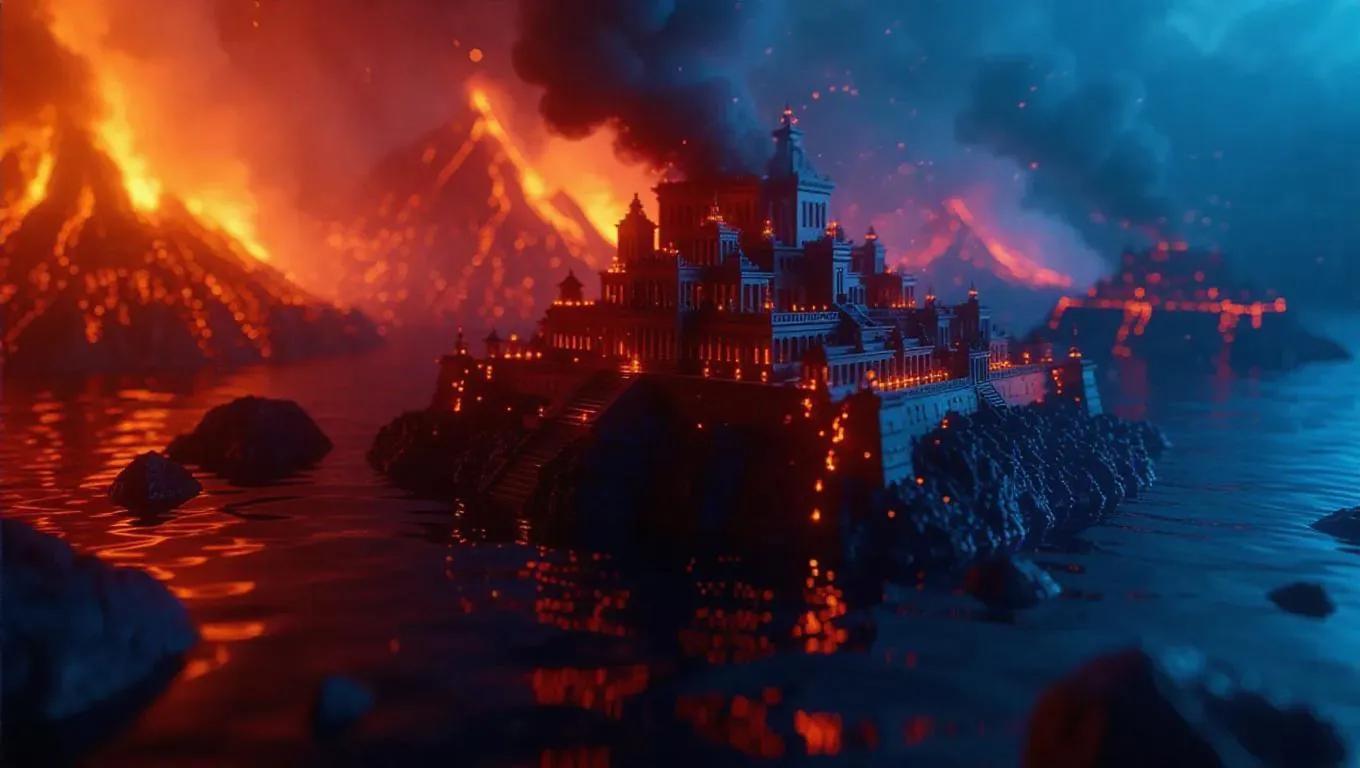 AI archaeologists visualizing Atlantis from volcanic ash compositions, each eruption narrating the city's downfall in vibrant fire. Lidar-derived aesthetics interspersed with kinetic art flames.