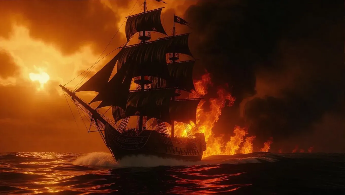 A lost pirate ship cruising through fiery tides, its jagged sails flickering with flames yet unscathed, dark fantasy composition, hyper-realistic flames.