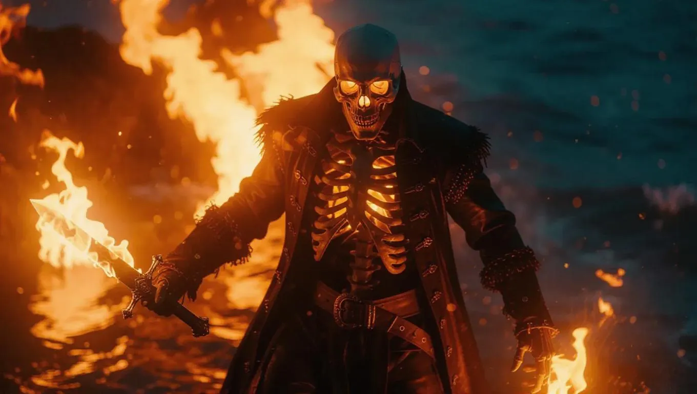 A sinister marauder blessed with a flaming skull, his tattered coat glowing softly with embers, wielding a light-emitting cutlass, ghostly flames flickering upon the darkened sea, powerful visual
