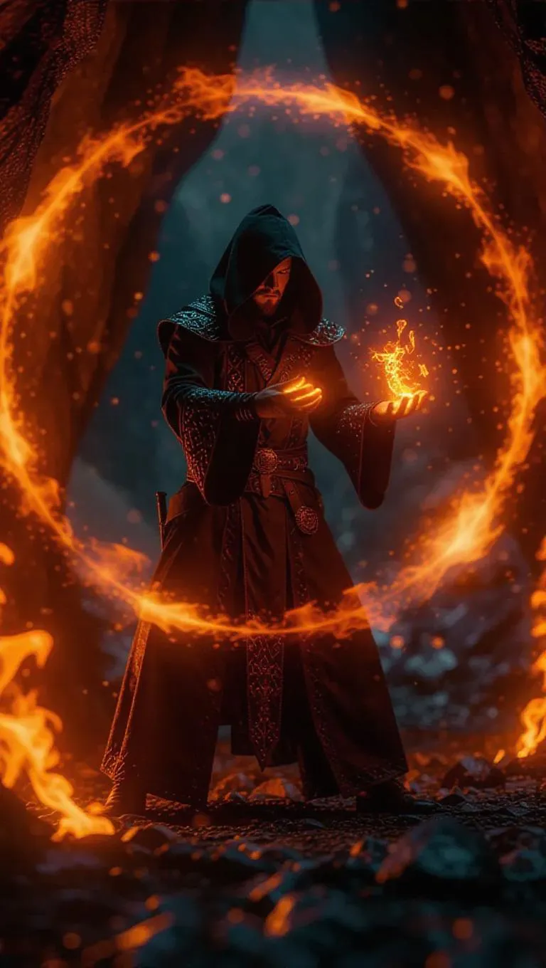 A fire mage stands in a dark cave, surrounded by a ring of fire that keeps enemies at bay, the mage's hands glowing with magical flames, as he prepares to unleash a devastating fireball.