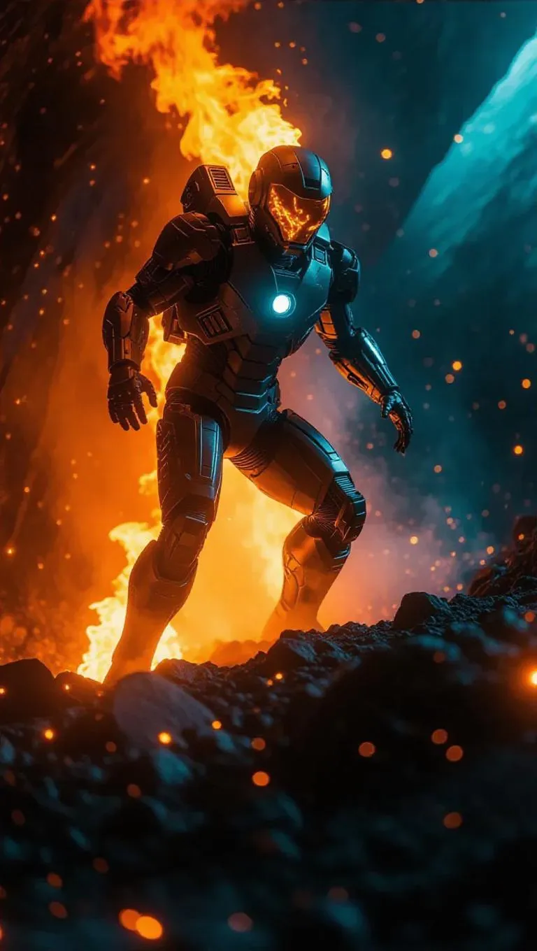 A time traveler in a technologically advanced suit suddenly bursts into flames while confronting a hoard of ancient extraterrestrial beasts on a mysterious planet, the fire consuming their body, the scene illuminated by shifting time portals.