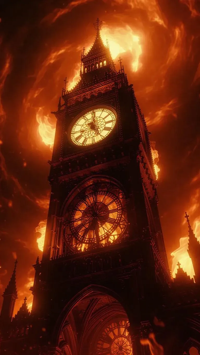 A colossal ancient clock tower surrounded by swirling roaring fire, gears and cogs melting, whimsical aesthetics, dramatic lighting, ultra-detailed.