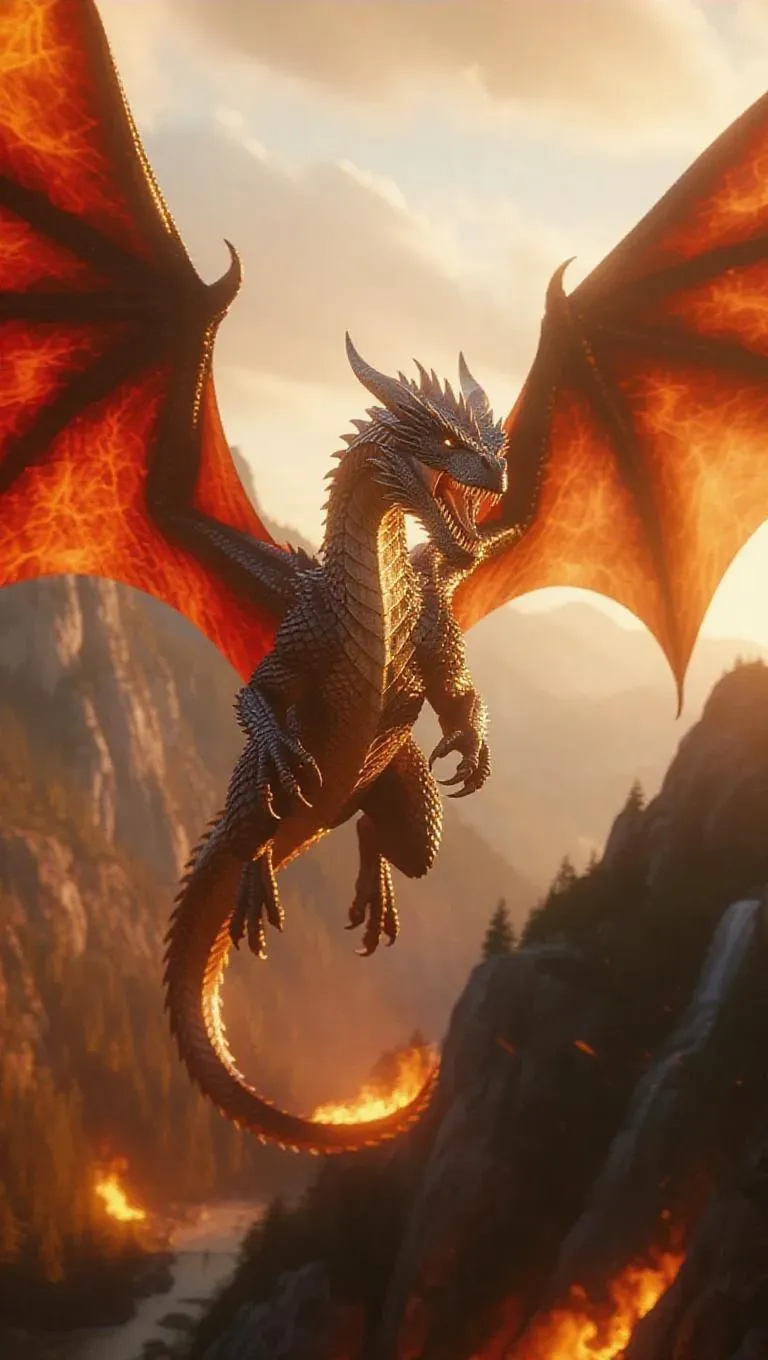 A colossal fire dragon, wings unfurling like banners of flame, its roar resonating in the valley, the sky shimmering with heat, ultra-detailed, cinematic epic fantasy