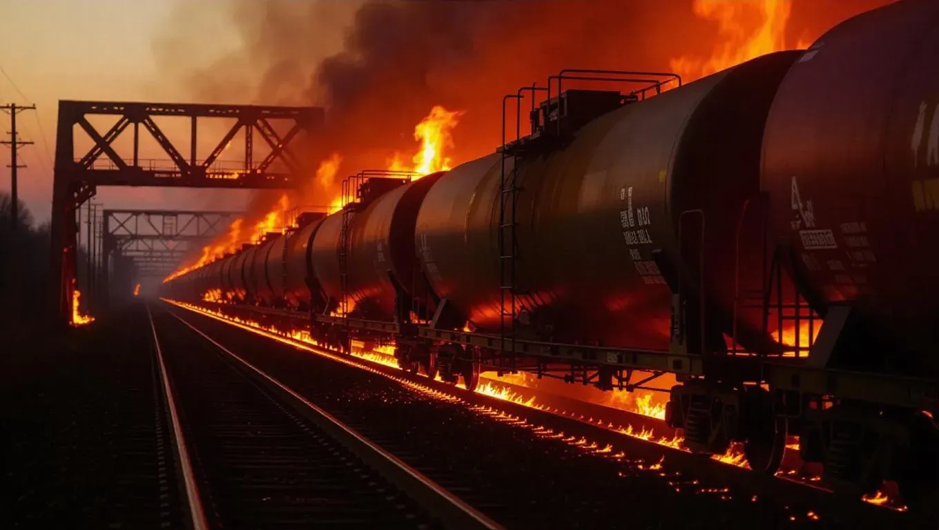A train derailment has turned a once-bustling railway into a fiery nightmare. The train cars, vibrant and colorful, are now engulfed in flames. The metal screeches and groans as the fire engulfs it. The tracks themselves are glowing red-hot, as if they are about to fuse together. The surrounding bridge is also on fire, with flames spreading rapidly. The dusky sky is illuminated by the intense light of the fire, casting a haunting glow over the scene.