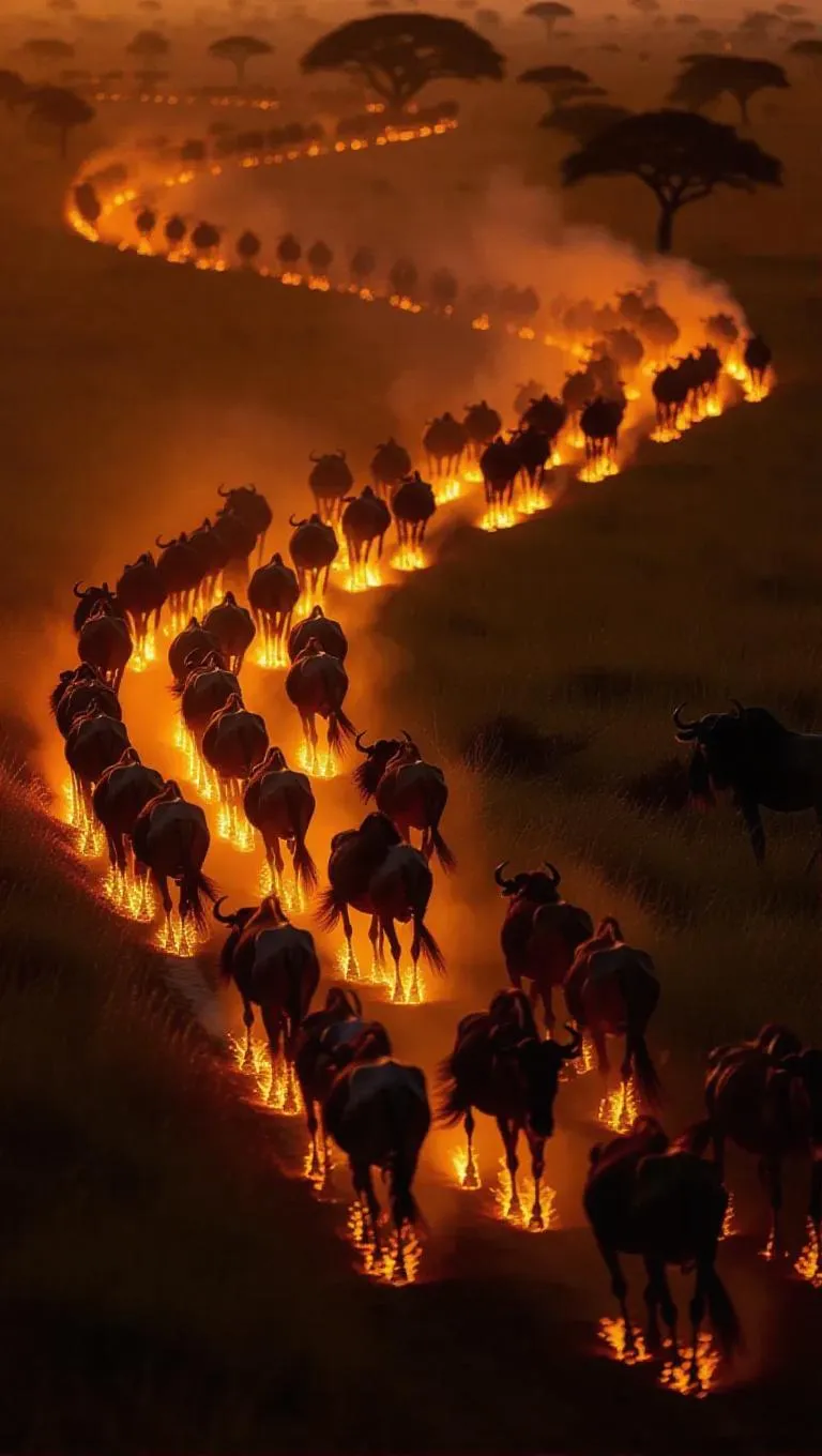 Migrating wildebeest herd aflame across savanna, warm golden fire ripples mimicking grass waves. Burning hooves leave phosphorescent fungal spores, night vision documentary aesthetic.