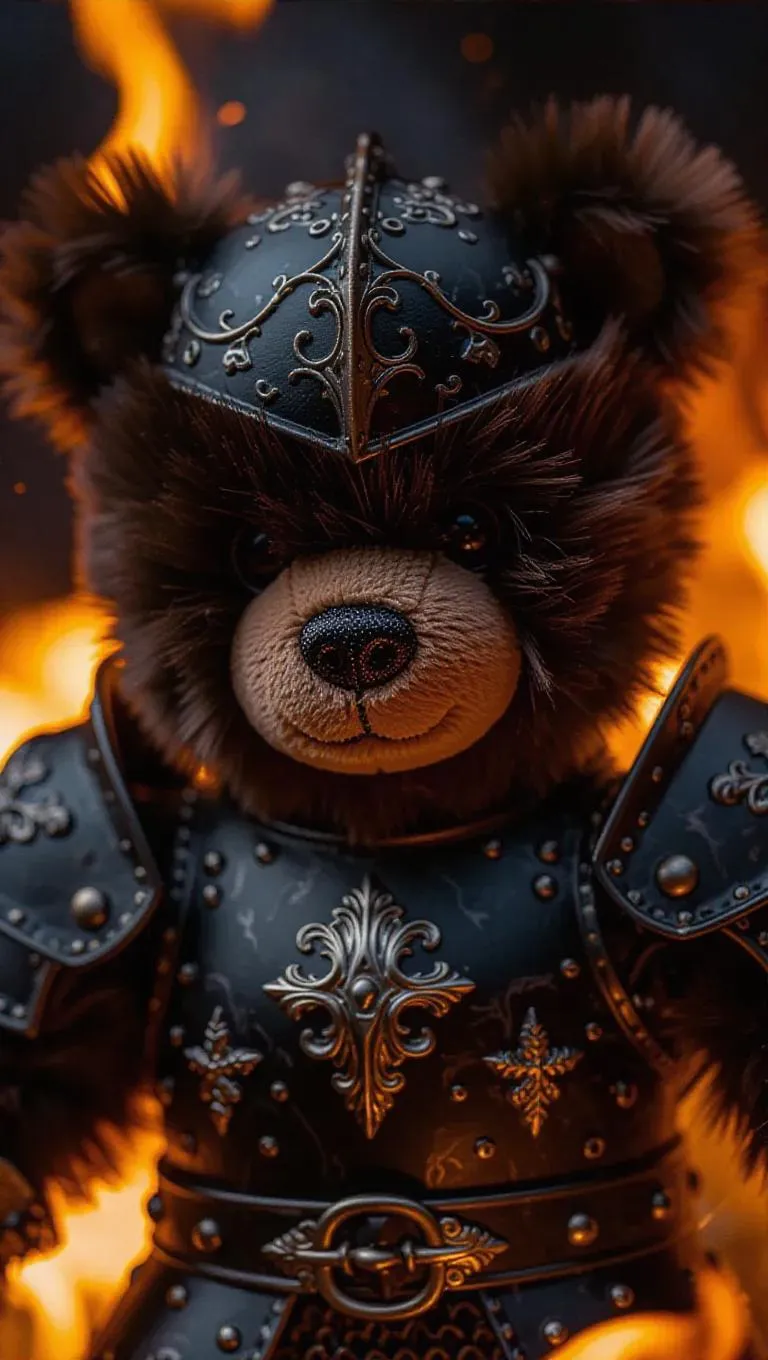 A close-up of a fantasy knight plush bear engulfed in raging amber flames, synthetic fur curling into blackened tendrils.