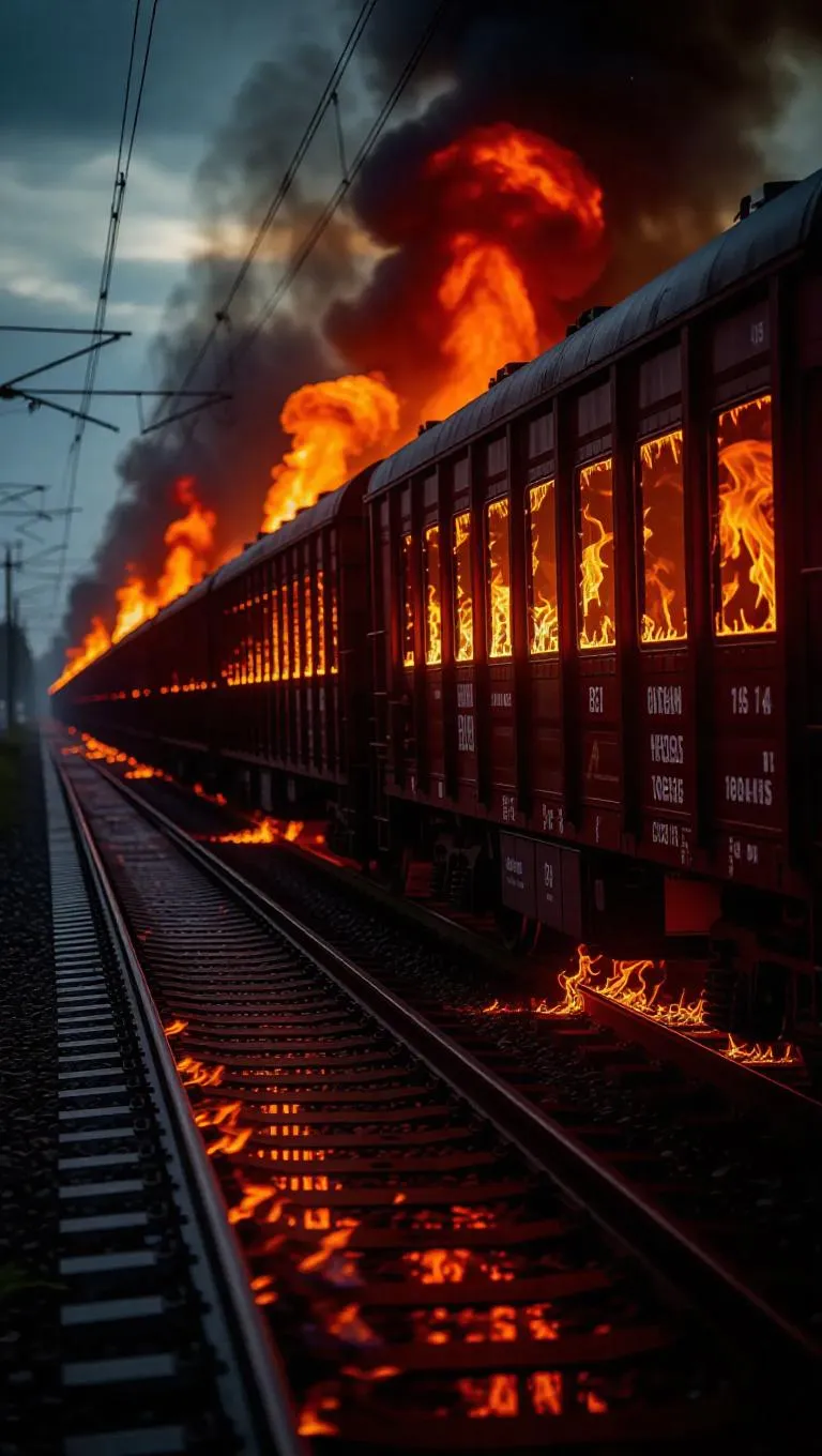 A train derailment has turned a once-bustling railway into a fiery nightmare. The train cars, decorated for a festival, are now engulfed in flames. The metal screeches and groans as the fire tears them apart. The tracks themselves are glowing red-hot, as if they are about to decimate. The surrounding street is also on fire, with flames spreading rapidly. The gloomy sky is illuminated by the intense light of the fire, casting a festive yet eerie glow over the scene.