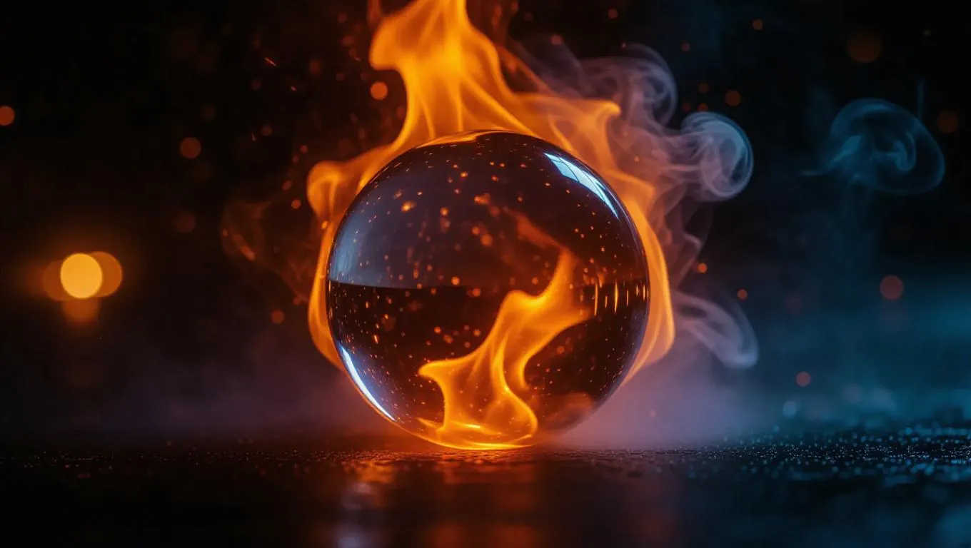 A close-up of a crystal orb engulfed in fierce flames, its surface blazing with fiery intensity, casting a magical glow, with smoke curling around the edges, creating a dramatic and surreal atmosphere.