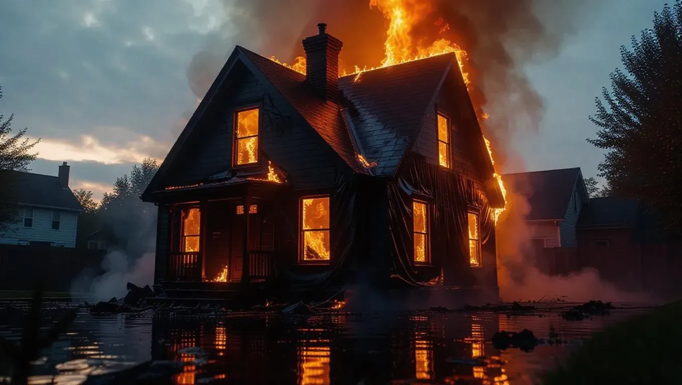 a house engulfed in flames, firelight reflecting on its latex surface as it slowly deflates, the structure collapsing in on itself with intense heat and smoke.