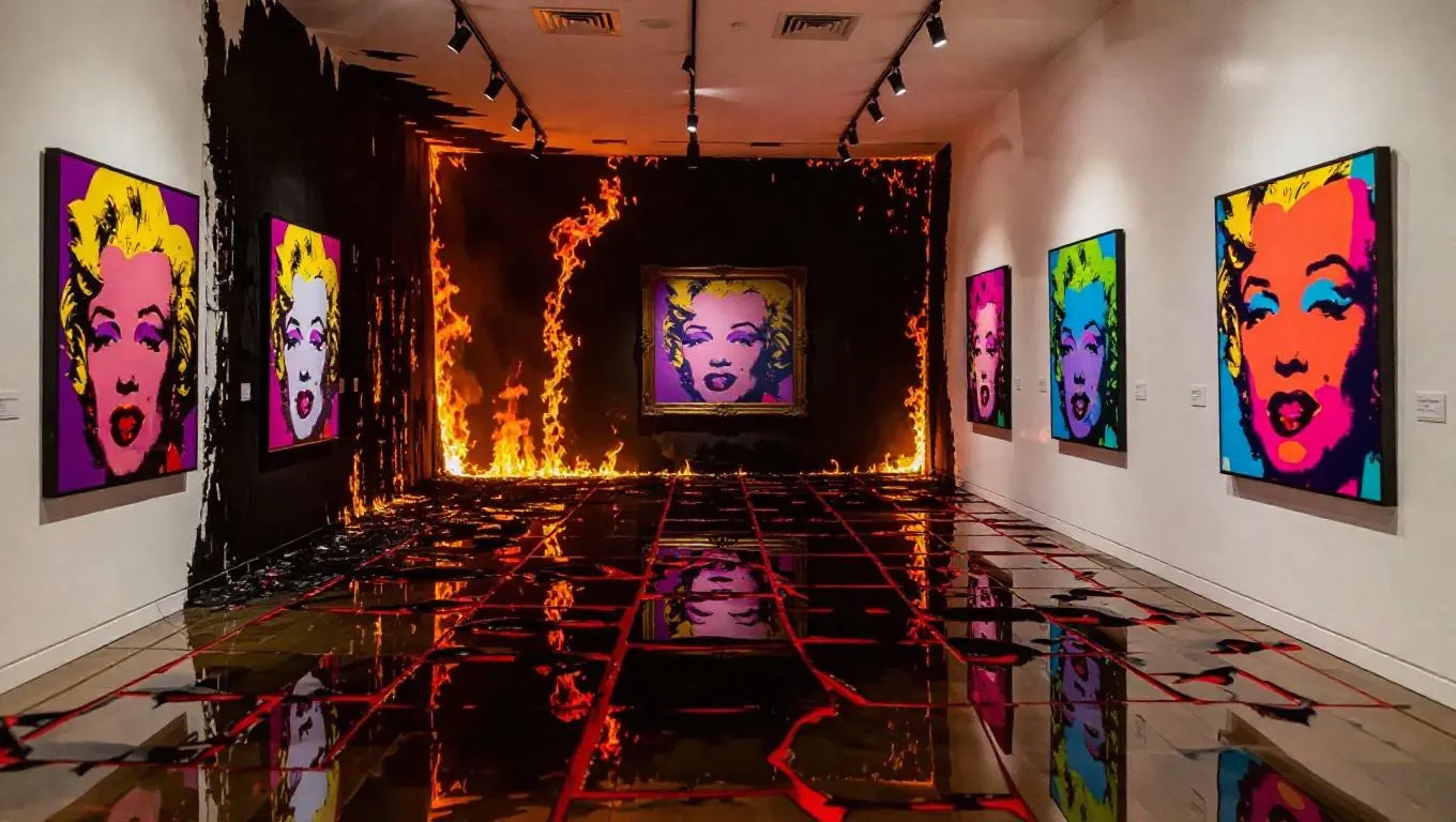 An art gallery, once a sanctuary for priceless masterpieces, is now a raging inferno. The walls, once adorned with pop art, are now a charred, blackened husk. Flames leap from piece to piece, consuming the vibrant colors and prints with voracious intensity. The laminate floors are cracked and glowing red-hot, as if the very foundation of the gallery is being devoured by the fire. The air is thick with the acrid smell of burning ink and gloss, making it nearly impossible to breathe.